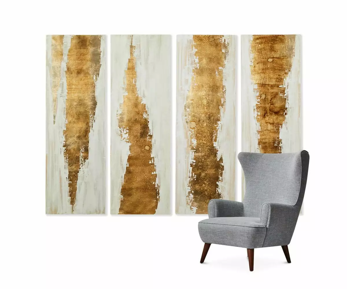 Grab the attention of everyone who walks into your room when you decorate with the Abundant Trail Wall Art. Four tall, vertical panels hand-painted in Mexico feature a white background with gold leaf accents. Give your space striking texture and visual intrigue with the addition of this unique artistic design. Set of 4.