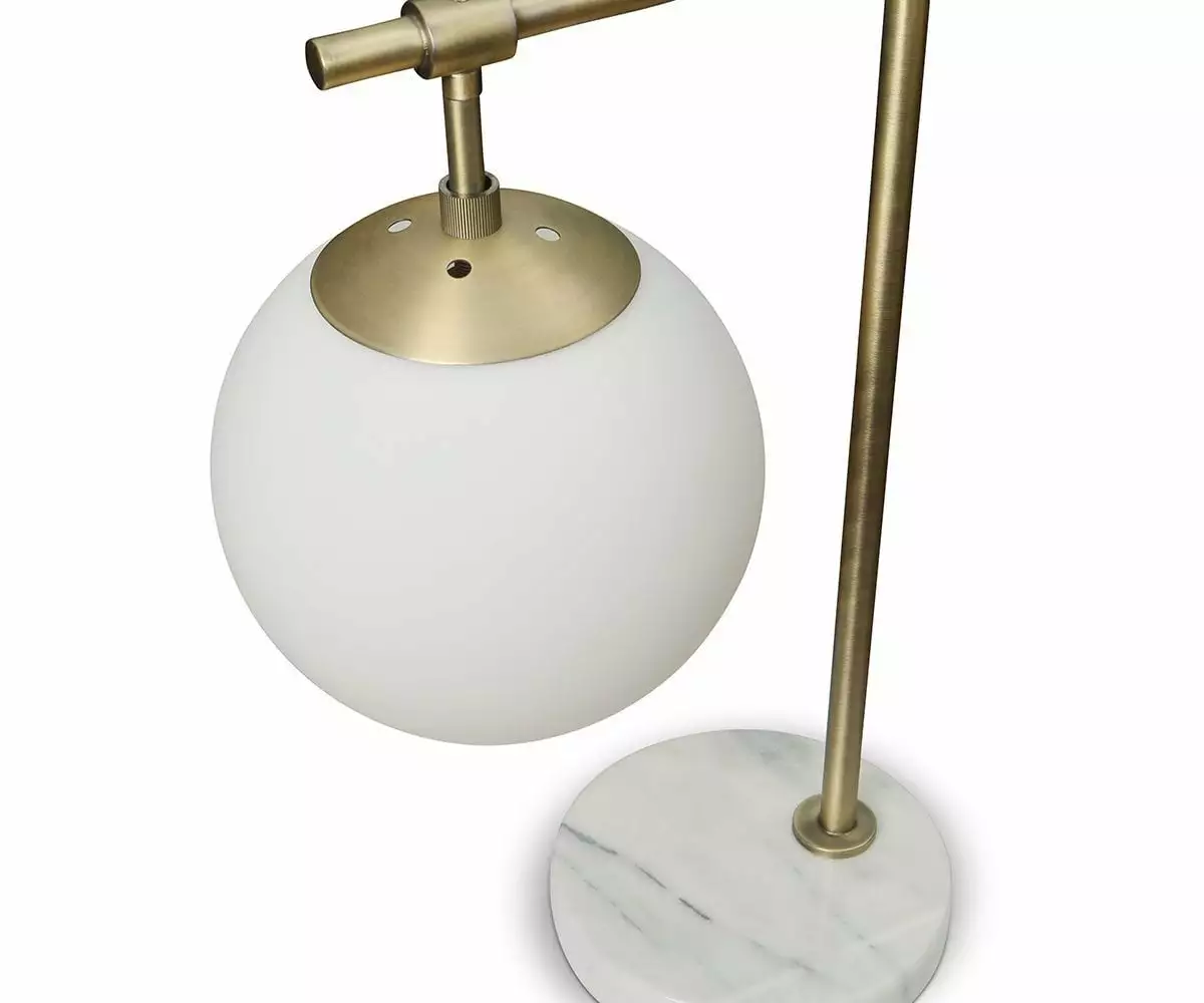 The intriguing design of the Aerlig Table Lamp blends vintage style with modern flair to create an eye-catching piece for any room. A round glass globe intentionally oversized for its height, suspends from the metal arm that connects to the tubular stand in a matte brass finish with a round marble base.