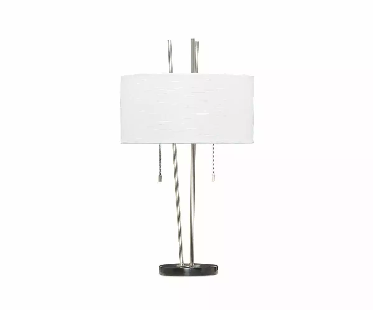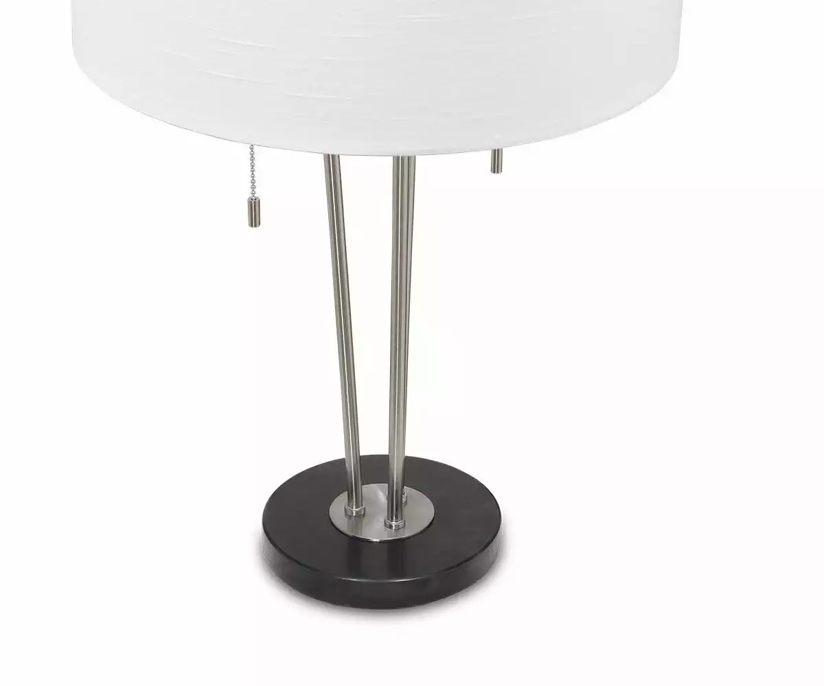 Bring an architectural vibe to any table with the Anderson Table Lamp. This modern design features three steel poles and a large textured linen drum shade. Two on/off pull chains allow individual control of the two 10W LED bulbs.