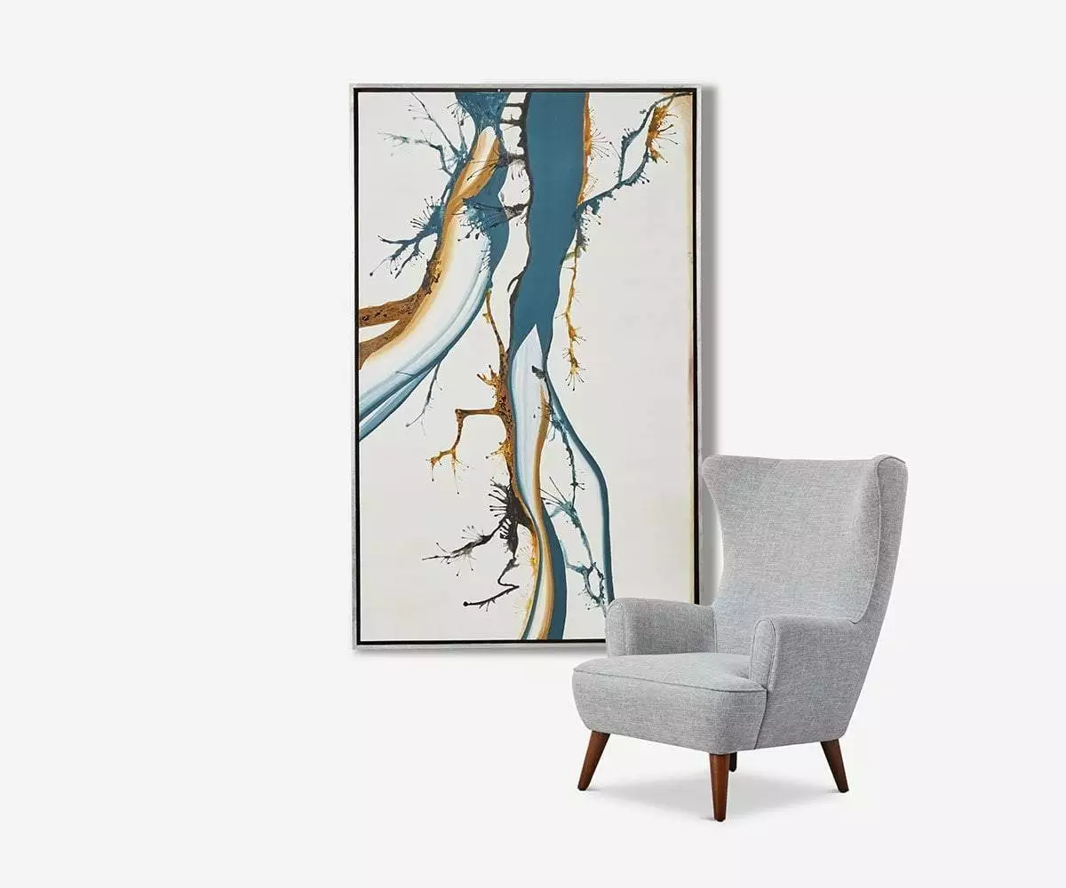 The Distinctive Abstract Wall Art features curated shades of blue blending into hues of the deepest gold. This combination of broad brush strokes and delicate spindling lines evokes a peaceful sense of water flowing gently as it catches the amber light of the setting sun. This artwork is hand-painted, making each piece unique from its peers.