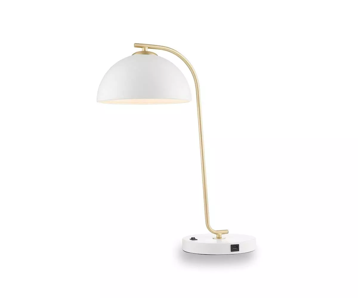 Graceful in its minimalistic design, the Dixon Table Lamp is the perfect addition to any modern space. A sturdy base anchors this piece, which features contemporary, flowing lines and soft shades of pale white and brushed gold. While the base and the shade of this lamp are matching in color, the golden, curving stem stands alone and brings contemporary flair to this piece. Featuring a switch and USB port located conveniently on the base, this task lamp is ideally suited for smaller spaces like a desk, or nightstand. Add this piece to your space and enjoy the way it illuminates your day-to-day while seamlessly meeting your charging station needs.
