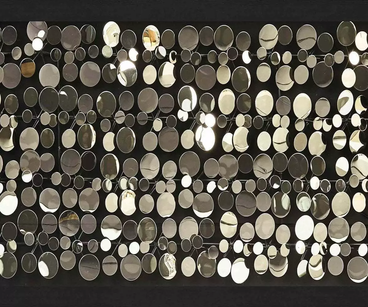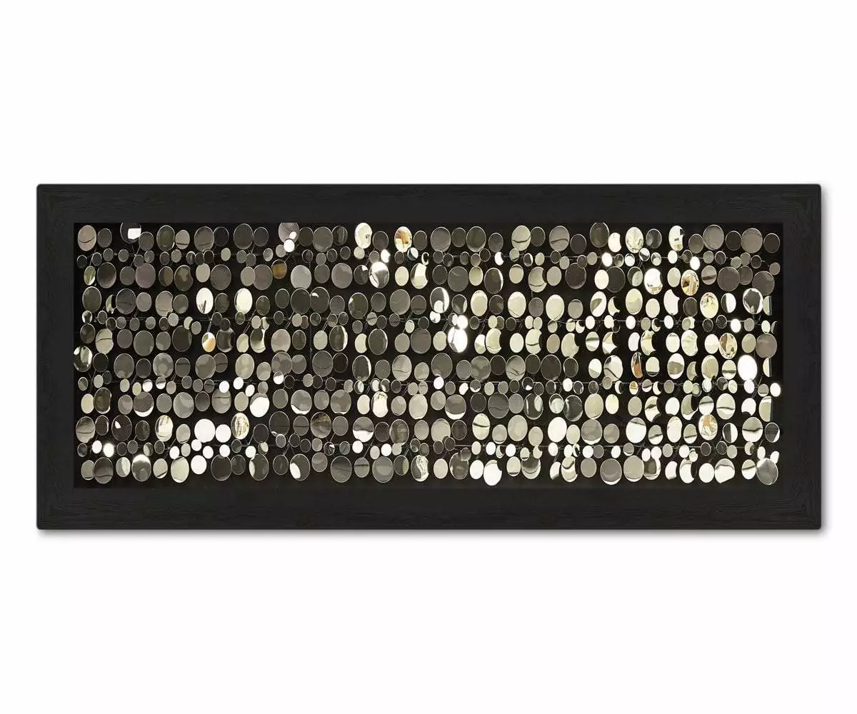 The Lagunaria Graphic features a dynamic array of stainless steel plates hung within the boundaries of a thick black frame. Designed to catch and reflect the light, this piece fills any space with a bold, lively presence.