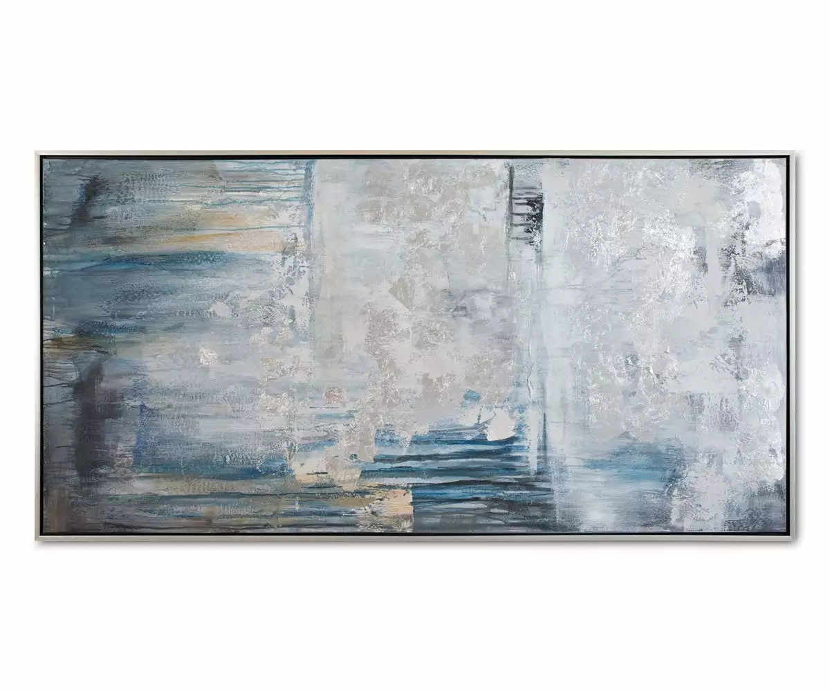 The Lyde Abstract Painting features a moody seascape of cool hues to add a calming atmosphere to your home. Includes a thin silver colored frame.