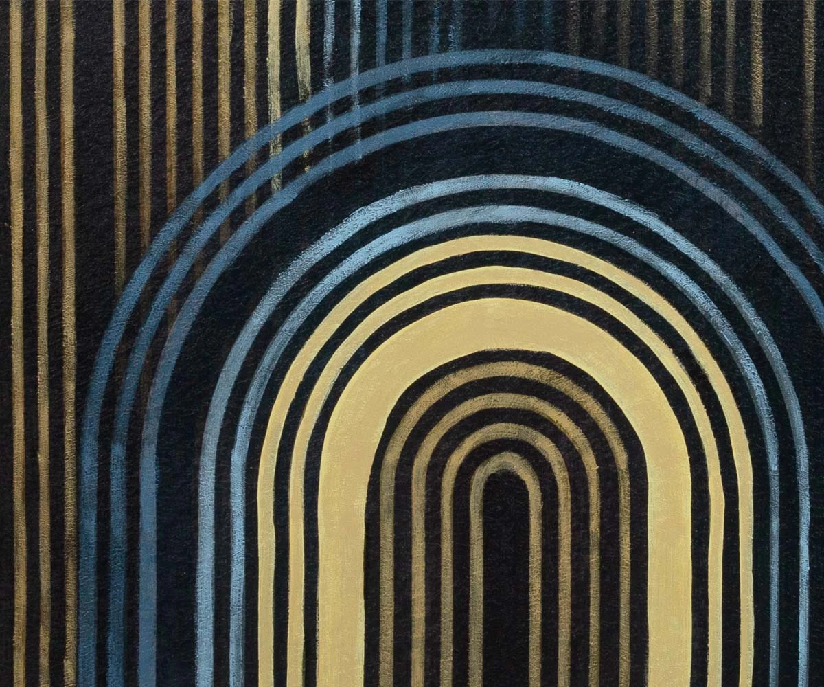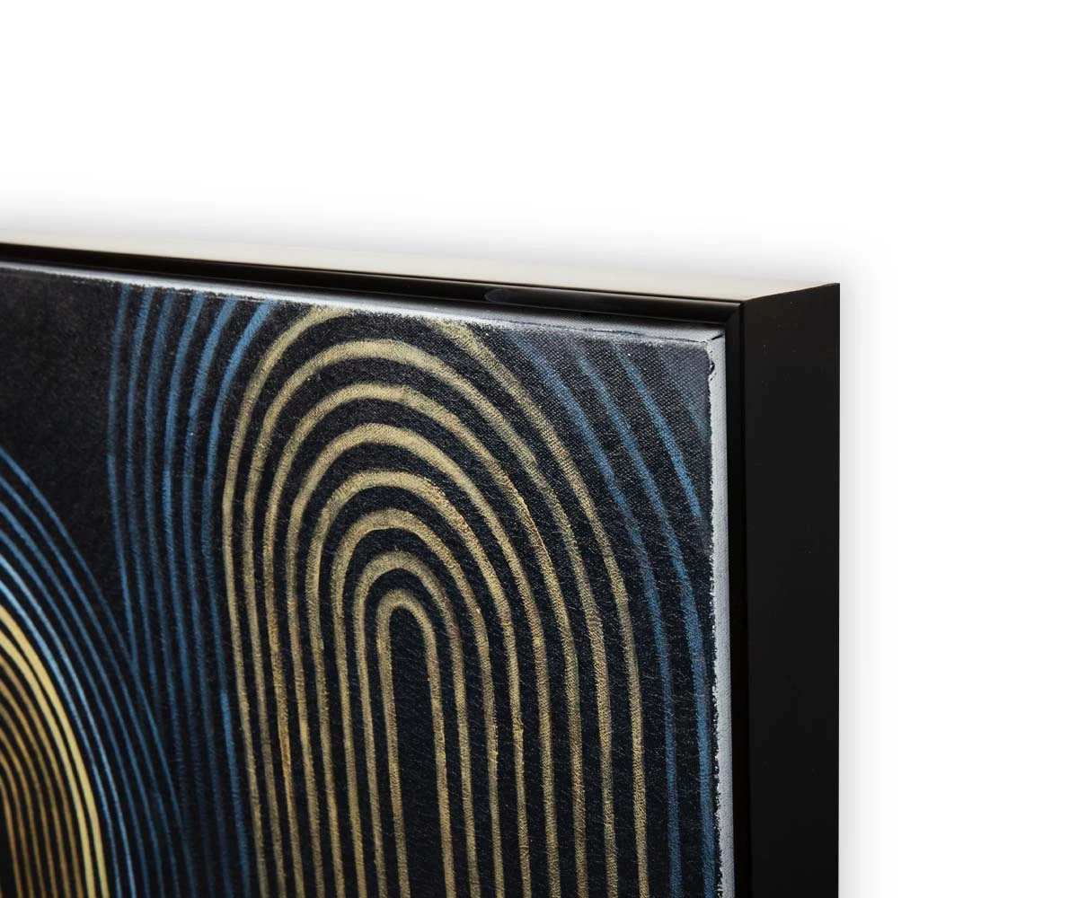 Anchor your aesthetic with the rich, dark hues of the Midnight I Oil Painting. Inspired by the vibrant contrasts and clean lines found in pop art, this piece showcases the inky curve of arches punctuated by bright lines that lend themselves to a dimensional, dynamic feeling. Hand-painted with 100% oil paint on canvas and set in a black frame, this modern piece pairs well with the Midnight II Oil Painting. Hang this duo on a wall together to create a gallery wall effect, or pair with the Midnight Mountain Oil Painting for a cohesive set of pieces that naturally infuse your space with a midnight motif. Midnight II Oil Painting and Midnight Mountain Oil Painting each sold separately.