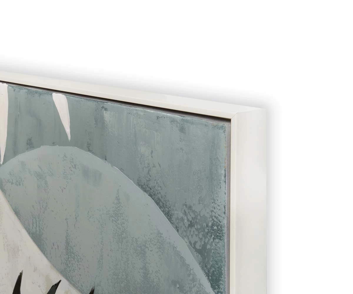The Moonlit Palm Oil Painting lends any space the feeling of balmy tropical nights lit by a full, bright moon. An easy companion to the rest of the Moonlit Oil Painting Collection, this piece can be displayed as part of a gallery wall, hung alone on a single wall while the other two Moonlit pieces ornament opposing walls, or even as part of a dynamic trio hung ascending a staircase. Hand-painted with 100% oil paint on canvas, this piece features a distinct mid-century modern palette that’s beautifully balanced with the play of organic shapes and distinct modern motif. A single palm frond is highlighted in the foreground, while subtler palms reinforce the tropical feeling in the background. Seemingly lit by a full, bright moon, this piece is wreathed by a white frame which complements the lighter tones within this piece in a fresh, breezy way.