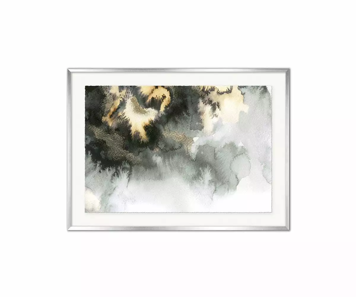 The framed Rising Tides print brings a sense of abstract glamour to any room. Starkly contrasting light and dark hues are accented with shades of soothing sea foam green and bright gold, evoking thoughts of the wild ocean after a storm. Display this piece in your home for a touch of undeniable contemporary elegance.