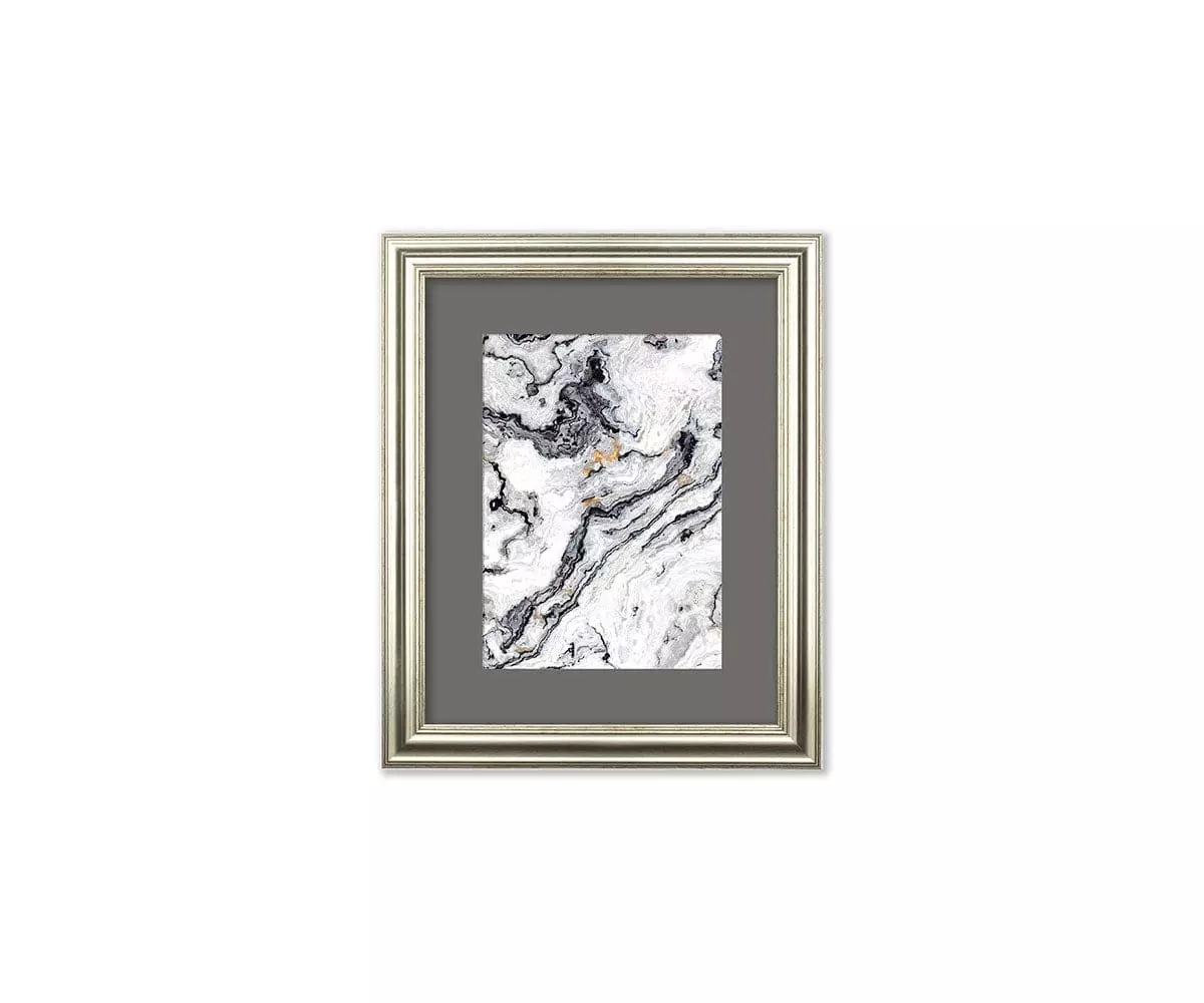 The swooping lines of the framed Silvery Surrealism I print are both abstract and opulent. Reminiscent of marble with its ebbing and flowing striations, this piece brings a sense of elegant minimalism to any room in which it is displayed. Hang this piece by itself for a solo statement, or pair it with the framed Silvery Surrealism II print to complete the look.