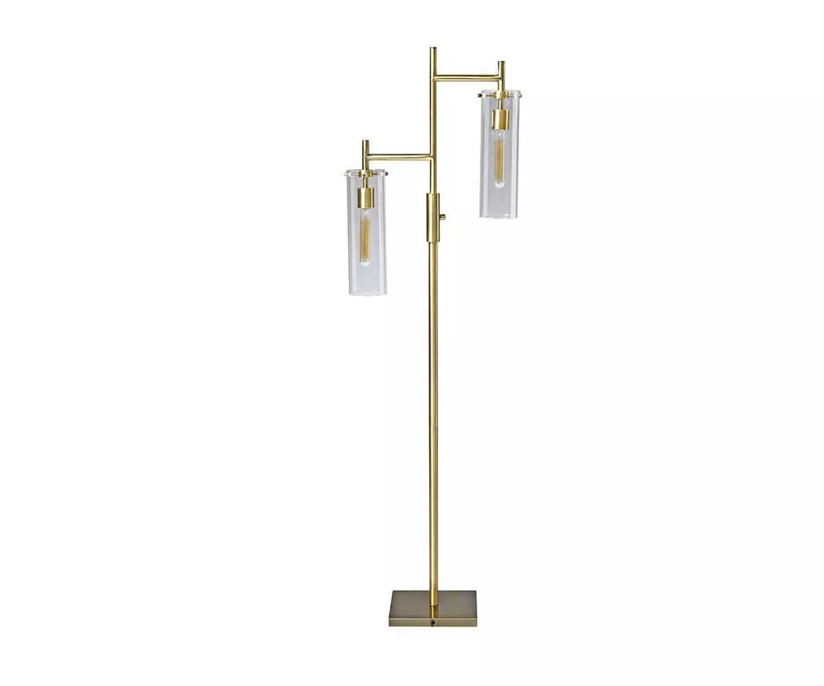 The Storm Floor Lamp offers nostalgic touches with a contemporary twist. Featuring an antique brass finish, it stands with two long, rounded glass shades. Enjoy finding just the right spot to place this new accessory made to capture your attention while casting a lovely light in your space.