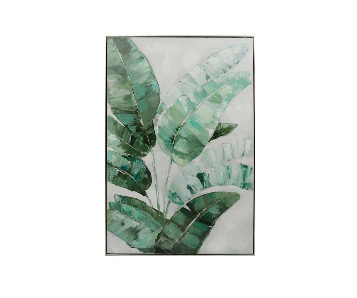The Tropical Breeze I Oil Painting brings to mind thoughts of lush, leafy palm fronds waving gently in a balmy island breeze. Hand-painted on canvas with 100% oil paint, this piece features wide, heavy brush strokes that add to the modern, organic feeling of this painting, while the carefully-depicted palm leaves bring a modern sense of island luxury to any space. A silver frame adds a hint of contemporary glamour, making this a transitional piece that’s easily paired with any number of motifs or decor styles. Partner this painting with the Tropical Breeze II Oil Painting to reinforce a relaxing, leafy motif and to bring welcome shades of soothing, tropical green into your space. Tropical Breeze II Oil Painting sold separately.