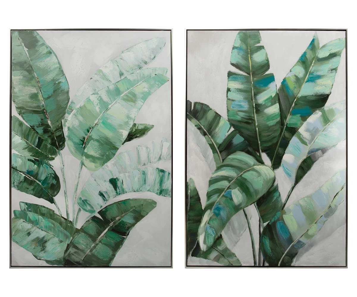 The Tropical Breeze II Oil Painting is hand-painted on canvas with 100% oil paint. Featuring wide, heavy brush strokes that add to the modern feeling of this painting, this piece brings to mind thoughts of lush, leafy palm fronds waving gently in a balmy island breeze. A silver frame brings a hint of contemporary glamour, making this a transitional piece that’s easily paired with any number of motifs or decor styles, while the carefully depicted palm leaves naturally infuse a modern sense of island luxury to any space. Reinforce your soothing leafy motif by pairing this piece with the Tropical Breeze I Oil Painting and to bring welcome shades of relaxing, tropical green into your space. Tropical Breeze I Oil Painting sold separately.