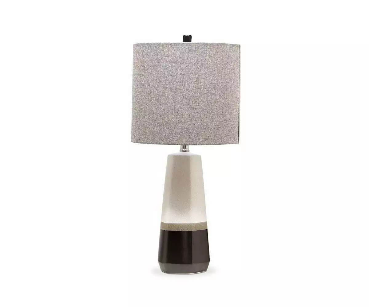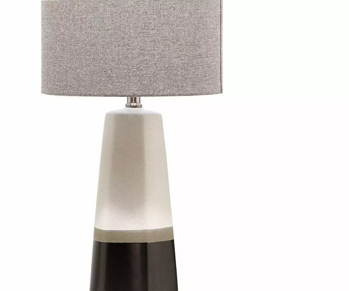 The Tunnusta Table Lamp delivers mod style with classic materials. The ceramic base is crafted in a black and white block design. Grey textured fabric is used for the balancing drum shade.